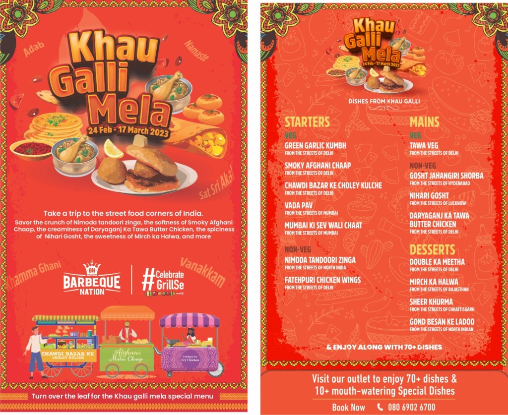 Barbeque Nation launched “Khau Galli Mela” , the street food festival from 24th Feb till 17 March 2023. As with all earlier food festivals of Barbeque Nation, this festival is also a huge hit with diners thronging the BBQN outlets in greater no. Even pre booking for seats is quite a challenge due to the popularity of the festival. Khau Galli Mela , the street food festival, presents a choice of zesty, popular street food preparations that are really spicy, and crunchy, bite after bite, offering popular street food dishes that are specially crafted by chefs.